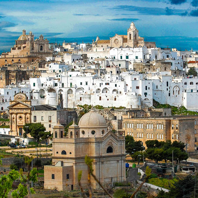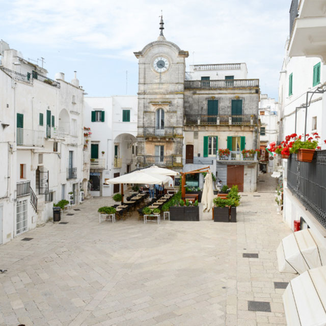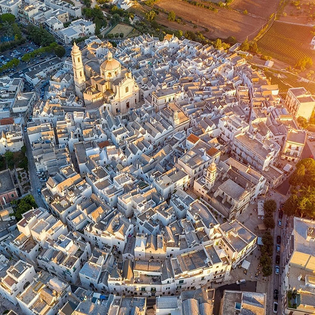 Built on the top of a hill, Locorotondo owes its name to the particular circular plan of the town (from the Latin “locus rotundus”, meaning round place), like all surrounding villages it has white buildings whose peculiarity is given by the presence of cummense, or roofs typical slopes of Nordic houses but here immersed in the colorful colors of the Itria Valley. From Locorotondo it is possible to enjoy balconies with exciting views of the rural landscape, consisting of a variegated mosaic of small vineyards surrounded by dry stone walls and centuries-old olive trees among the typical country lanes that lead to picturesque trulli.